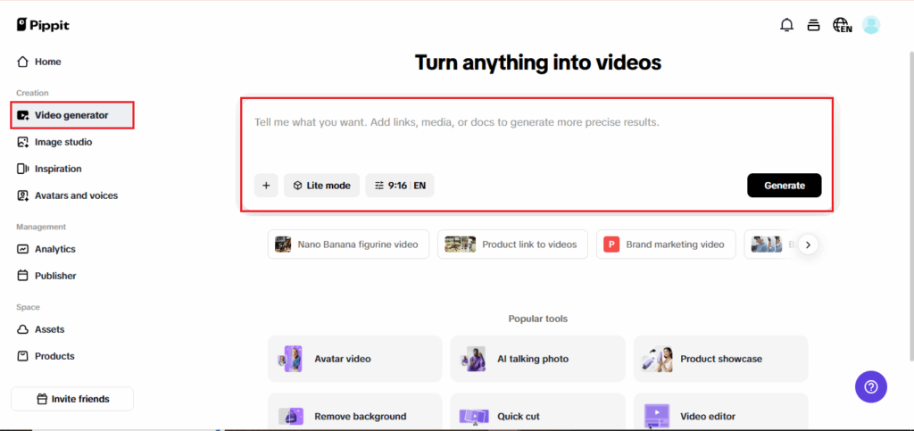 Sign in to Pippit, and go to the media upload section via the “Video generator” tab. Then, click “Add media” to include different images [from your device, cloud drive, or paste a product link]. Then, click “Generate” and let the AI identify images, then build your video frame. Add photos of your artwork, sketches, renders, or whatever visual inspires your creative self to the video.