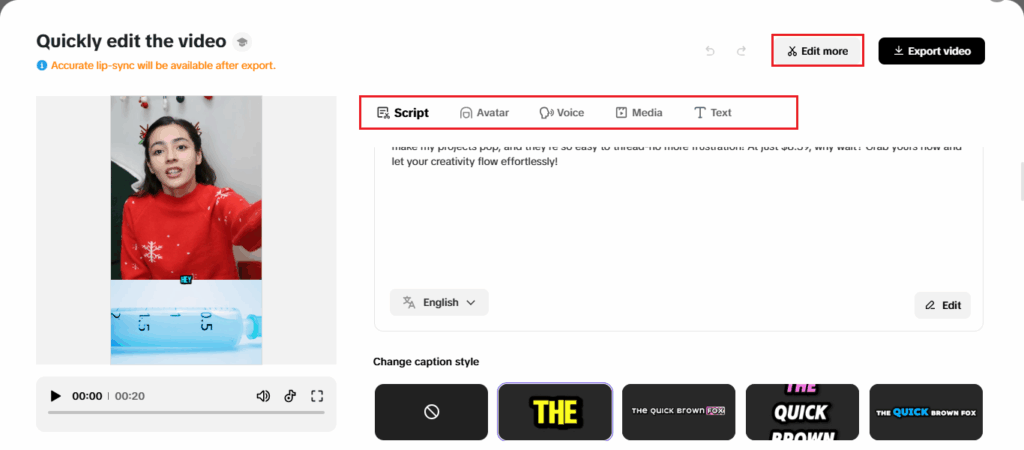 After you generate, preview your video, and use “Quick edit” for minor edits or go in to “Edit more” for more edits.